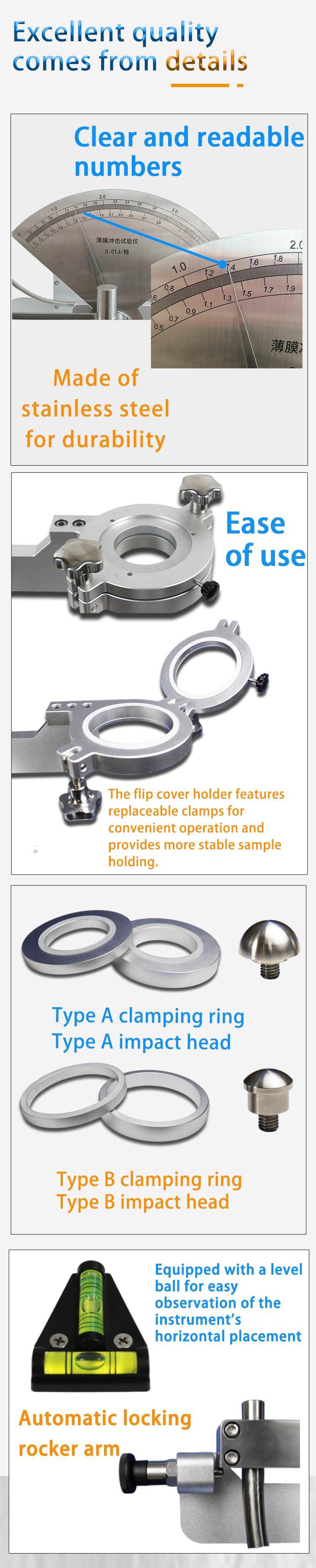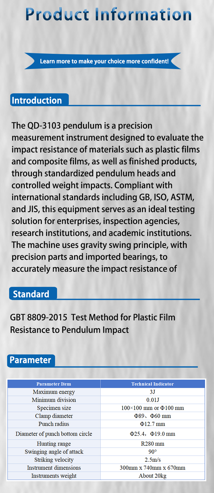 The QD-3103 pendulum is a precision measurement instrument designed to evaluate the impact resistance of materials such as plastic films and composite films, as well as finished products, through standardized pendulum heads and controlled weight impacts.